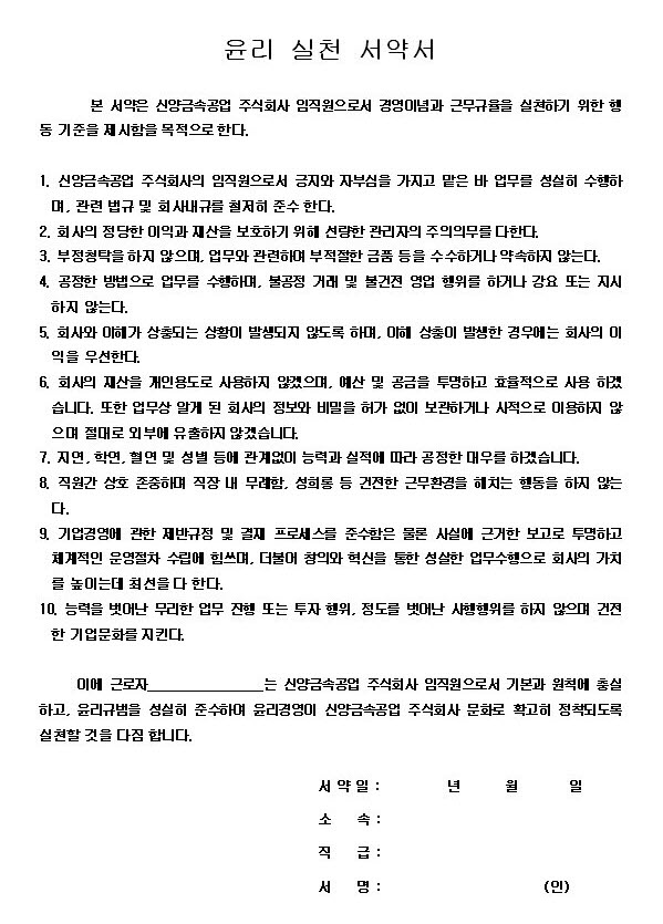 또한 신양금속공업 임직원들은 윤리를 가치판단과 행동의 최우선 원칙으로 삼고 투명한 기업, 고객으로부터 신뢰받는 기업을 추구합니다.