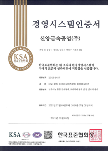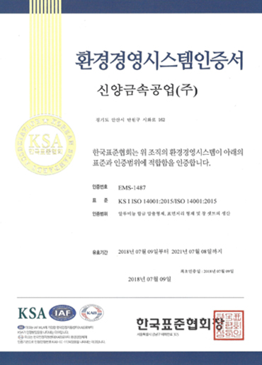 환경경영시스템 (ISO14001) 환경경영시스템을 바탕으로 임직원의 적극 참여를 통해 환경위험성을 체계적, 효율적으로 관리 및 개선 환경경영시스템 모델 ISO14001 인증서 경영시스템인증서 발행일 18.07.09 유효기간 18.07.09 ~ 21.07.08 환경경영시스템인증서 발행일 21.08.05 유효기간 21.07.09 ~ 24.07.08
